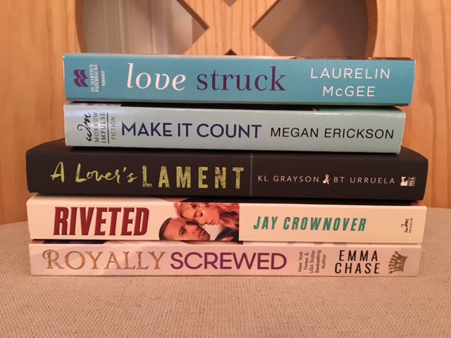 These are all books I purchased from the bookstore where I work. I've read the bottom one, but loved it, need to review it soon. The top four are all new to me, and Riveted of course just came out on Tuesday. The top four are all authors that I can meet next month at the two conventions I'm going to. I've met Jay Crownover before, but will definitely get more autographed from her!